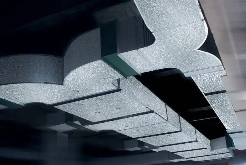风管的连接形式分为两种:PVC 法兰连接及插销连接;铝合金法兰连接及自攻螺钉连接。在检查对接风管的法兰无误后,将“H”形的插销拧人 PVC 法兰中,拧插销时,注意力度的控制;力度太大易使法兰破裂,力度太小无法打进插销。PVC 配套法兰连接完成后,应在风管的四个边角处打玻璃胶起密封作用,然后安上外角盖。铝合金法兰连接。当风管与风管的连接或风管与配件的连接需用到铝合金各种类型的法兰连接时,按用到的螺栓或螺钉型号配孔,连接法兰的螺母应在同一侧