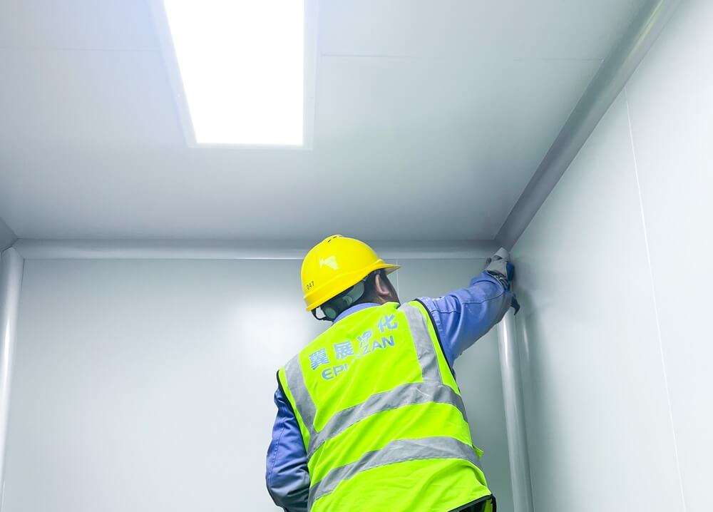 撕膜清洁密封:撕膜前应具备的条件:各专业末端如高效过滤器、灯具、回风口、管线阀门、插座、排风装置等均己安装;地面装修施工完成,并初步验收;洁净室进行彻底清洁吸尘处理。清洁密封是确保洁净室装饰装修质量的关键工序之一,清洁是在撕膜后对洁净室的再次清扫吸尘和对顶板、墙板的清洁、擦拭,它是进行密封的前提。密封一般是采用硅胶或其他洁净室用密封胶对各处板缝进行密封打胶。打胶要求饱满均匀,并略低于板面,为保证胶缝的均匀,在打胶前可在需打胶的接缝两侧贴上纸胶带。为保证胶缝的一致性,建议顶板均采用插条式连接方式。
